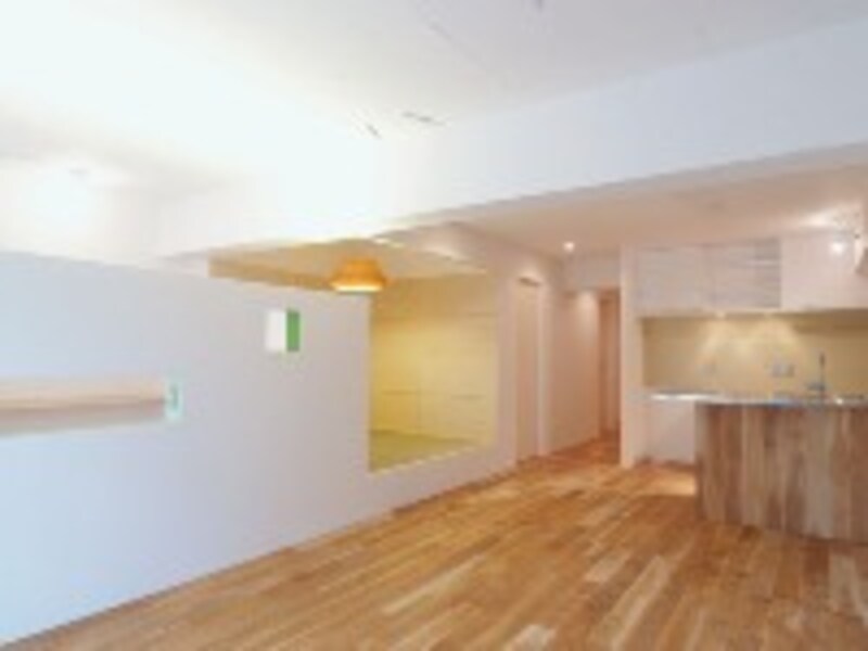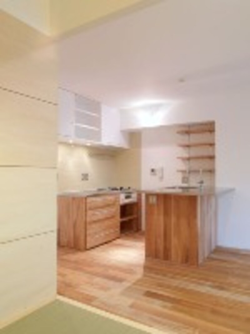 | キッチンの斜め前に位置するタタミの間。奥様は、タタミでくつろぐご主人を眺めながら料理を作る。 |