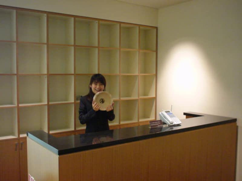 ■マシンルームと大浴場専用フロント。本邦初公開のビュロー特製風呂桶をもってもらいポーズしてもらいました(笑) |