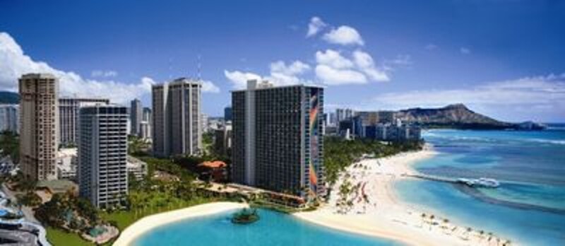 | ワイキキビーチに広がるヒルトン・ハワイアン・ビレッジ・ビーチリゾート&スパ。左手に見えるタワーが今回誕生した<グランド・ワイキキアン> |