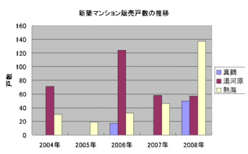 また3つの街の中で、供給数がコンスタントに多いのは、湯河原となっており、2005年を除き、毎年50戸以上が新しく販売されていることになります。一方、坪単価の高い熱海は、ここ数年は30戸くらいの販売しかなかったのが、2008年になって137戸と急増しています。