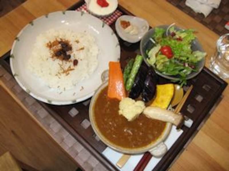| 「カフェ・カーム」自慢のオリジナル野菜カレー。刺激的な辛さがやみつきになりそう。器は奥様の手作りです |