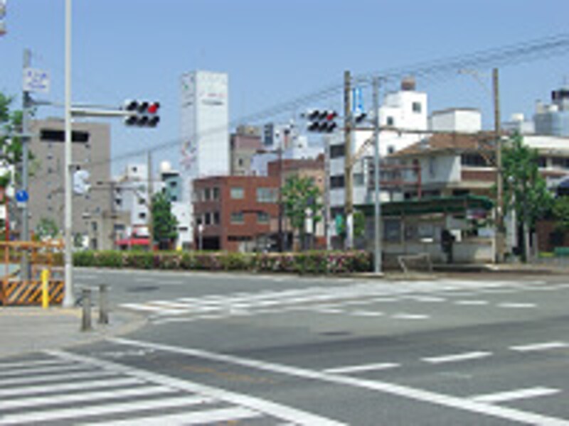 | (上)大道筋沿いの風景。事務所ビルと賃貸マンションが併存する(下)幹線道路から一本内側に入っても道路幅員は広い。駐車禁止の看板が置かれていたがこの日、路上駐車はナシ。 |