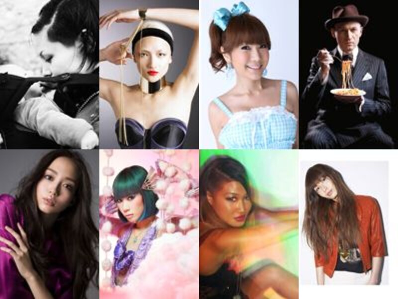 | 写真上段左からTOKO(DJ)、冨永愛(モデル)、はるな愛(タレント、歌手)、Philippe Cohen Solal(ミュージシャン〈Gotan Project〉)。2段目左から松島花(モデル)、MADEMOISELLE YULIA(DJ、「GIZA」デザイナー)、YOON(ビジュアルディレクター)、LENA(モデル)。 |