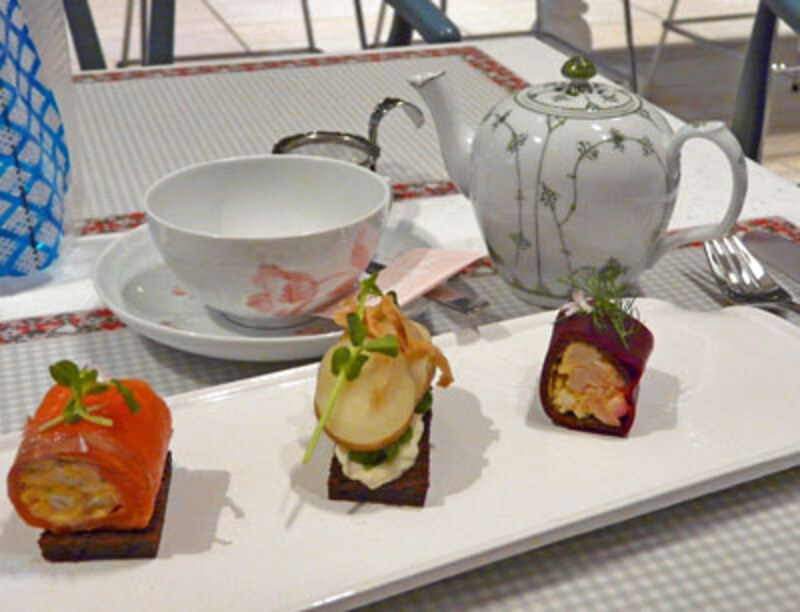 デンマークのライ麦パンをベースにして、その上に独創性豊かな素材を乗せたり、スモークサーモンでパンやいろいろな素材を巻いてみたり。鮮やかな色使いや、凝ったデコレーションにも惹きつけられます。ほぼ一口サイズ大くらいで、あっという間に食べられますが、弾む感動が余韻として残りそうです。
