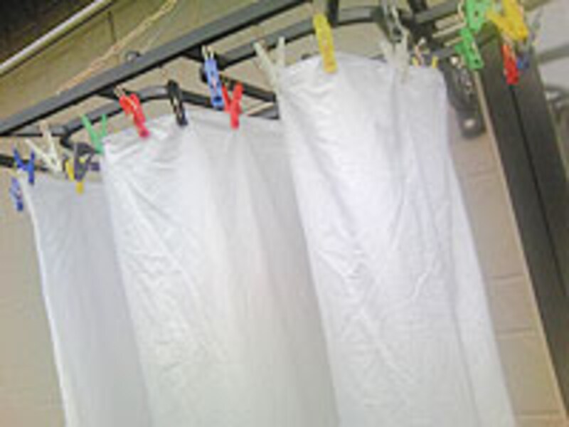 バスタオルやシーツなど大きなものを洗わなければならなくて、"ちょいがけ"が無理なばあいは、横長にもって長い辺をジグザグにし、ピンチハンガーに留めて干せば、重なり部分ができず乾きやすくなります。