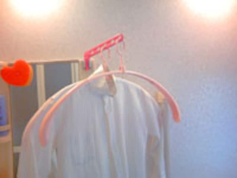 | トレーナーハンガーはシャツ類を乾かすのにも大活躍。 ちなみにハンガーかけ部分(濃いピンク)はシャワーホルダーに差し込む浴室用の物干し。これも便利ですヨ。 |