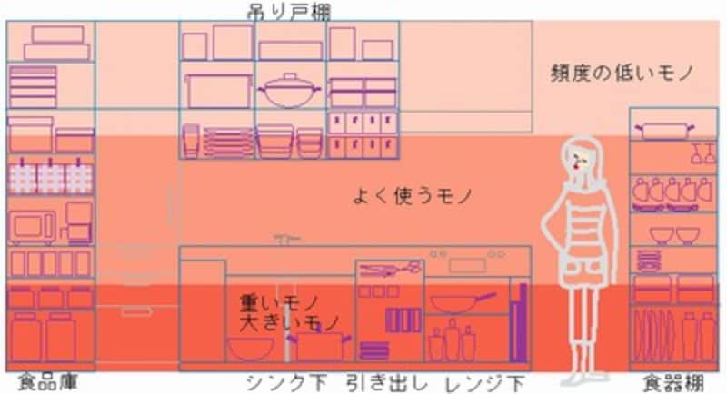 そこで、よく使うモノを無理のない高さに配置したいのですが、下の絵を見てもわかるように、使いやすい範囲はそずいぶんと限られています。そのため、収納はたくさんあっても使いにくい場所が多いので、モノが出たままになったり手前にしまったモノしか使わなくなるというわけです。