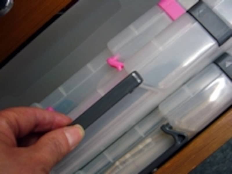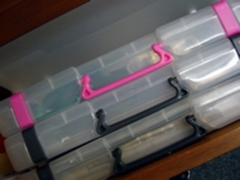 書類を分けて、立ててしまって、持ち出せるケースを百円ショップで見つけました。書類ばかりではなく、工具、文具、裁縫道具などバラバラになりがちなモノをセットにして収納。ハードケースなので引き出しの中に立ててしまったり、本棚に並べておくことも可能。A4サイズに統一しておくと、ケースの中身が何であれ四角くまとめることができて、整然と並んでいる姿は見た目にも整理上手な印象を与えます。