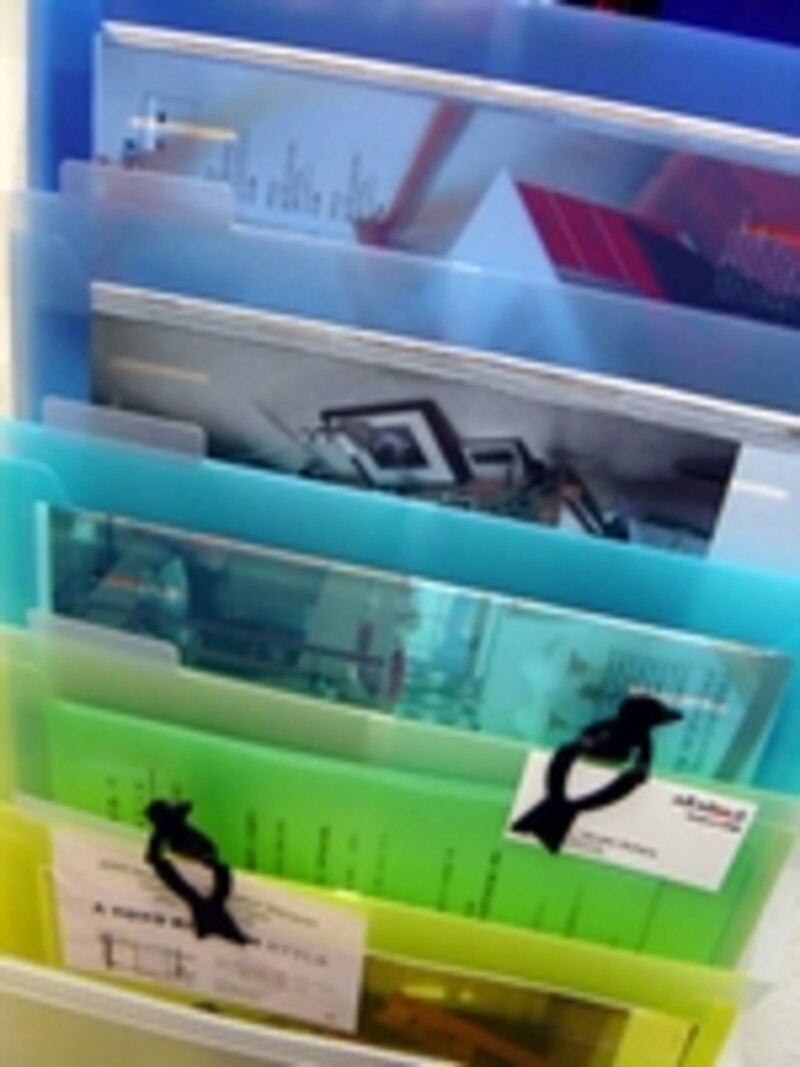 時間を有効活用するためには、必要なモノがすぐ手に取れること。原稿を書いている時、デリバリーを頼む時、明日の予定を確認する時など、見たい書類がサッと取り出せる状況を作っておきたいものです。そのためには書類を月別、目的別、テーマ別などに分類して、その分類に沿ってファイルにまとめておくこと。そして、その分類別ファイルが一目見ただけで全体のわかる仕組みになっていると便利です。そこで見つけた商品が下の画像にあるような6分類できるファイルポケット。カラー別に仕分けてインデックスを付けておけば書類は一目瞭然。しかも、壁掛けにできるフック付きなので、職場のパーテションに引っ掛けることもできます。