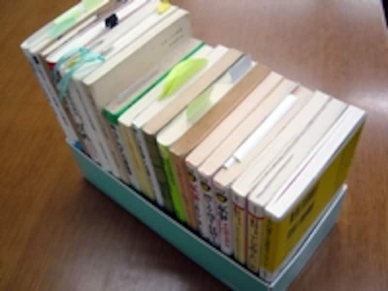 そこでひと工夫を加えることをお薦めします。そのひと工夫に程良い物が、どこの家庭にもあるティッシュボックスです。このボックスのサイズは約11センチ×25センチ。ということはボックスの手前から奥に文庫本を並べていくと、本の厚さにもよりますが約30冊ほどが収まります。こうして一塊りにしておくと、ボックスごと出し入れができるため本を探しやすくなるのです。