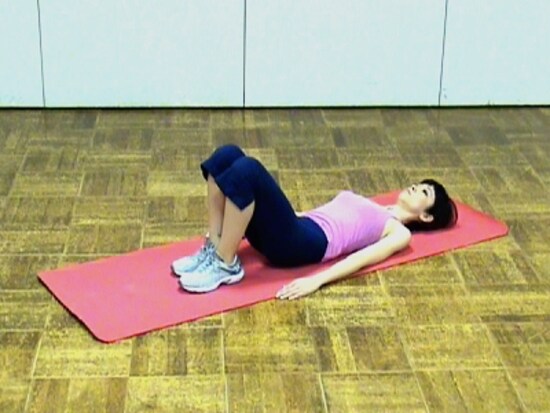 お腹エクササイズ1 床に仰向けになり、膝を立て腰を床に沈める
