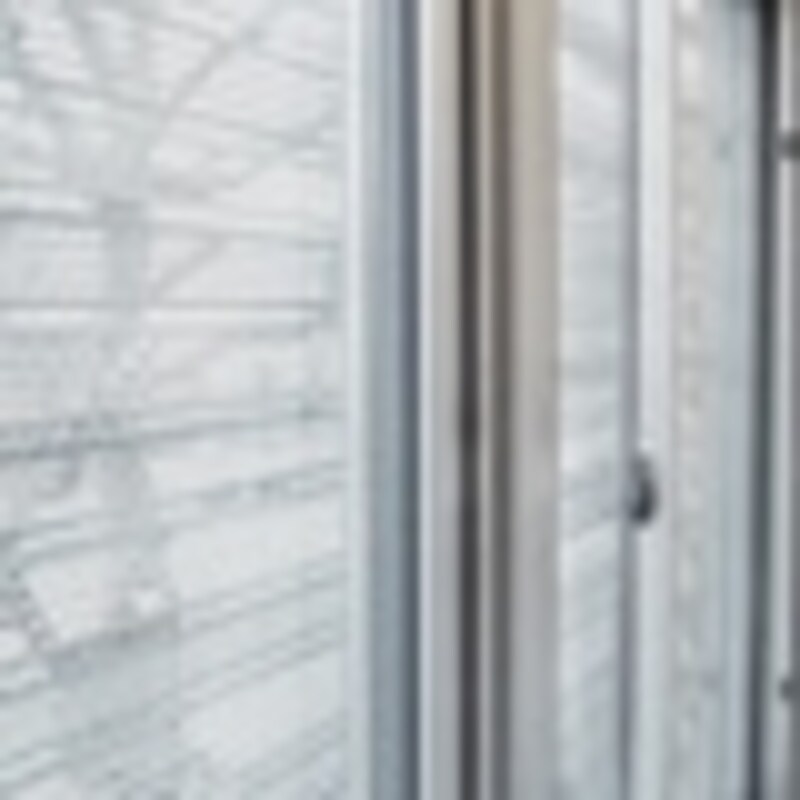 夜でもトラックの行き来が絶えない環八沿い。その一画に明るいグレーの楔型の小さな建物が建っています。ここは田園調布からほど近く目の前に6車線の広い空間が広がる立地です。さらにその先は学校のグランドなので空が広い。「マッシヴな石の塊のイメージ」と森さんが表現したこの家は一見窓が無いように見えますが、壁に取り付けた金属製の折板の奥にガラス窓があり、ここから室内に光を採り込んでいるのです。この丸い穴の空いたフェンスは歩道からの視線を遮りながら住民のプライバシーを守り、直射日光を柔らかく拡散させる役割もあるのです。