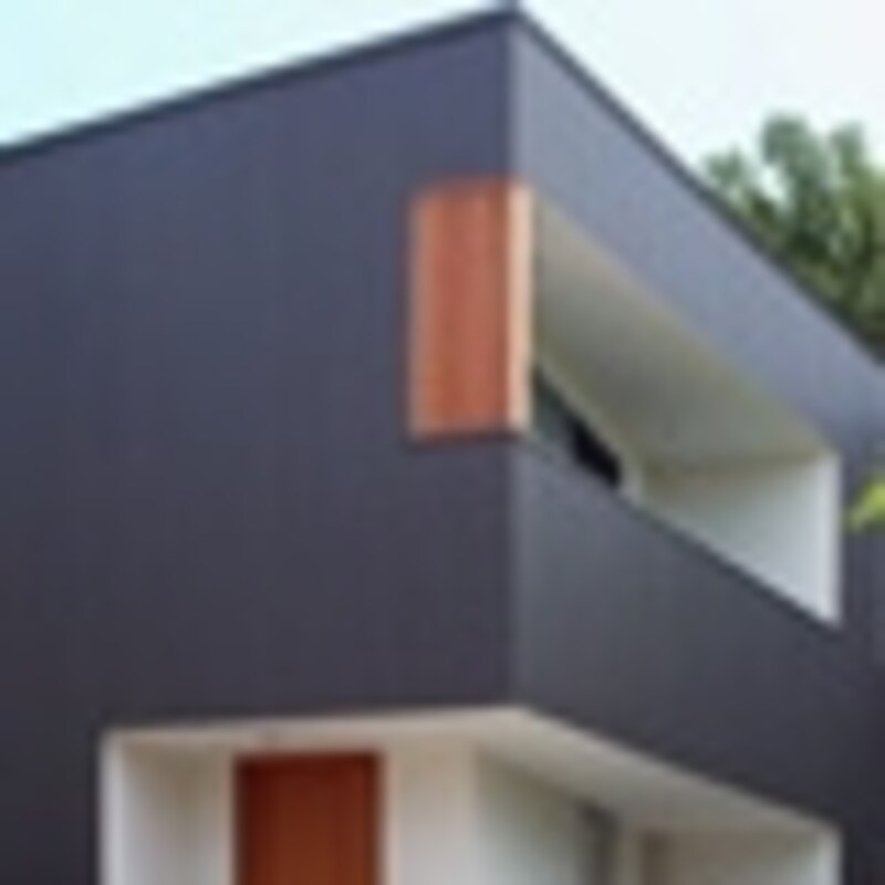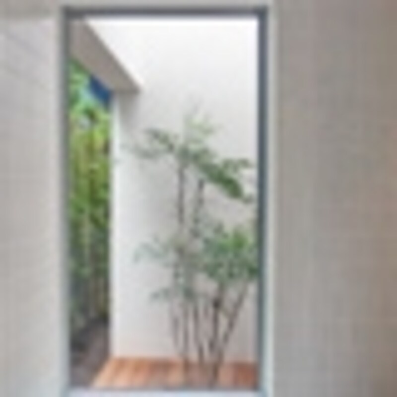 ここは北西方向が道に接しています。東西に奥まった斜面地のお陰で、2階からの眺めも良く、東南からの陽射しをたっぷりと受けることができます。外観は墨色の板金、白色の左官壁と木格子のバルコニーという3つの要素だけで、モダンでありながらも周囲の環境に馴染む落ち着きのあるデザインに仕上がりました。長く伸びる廊下の奥は、明るいLDKに続いています。
