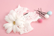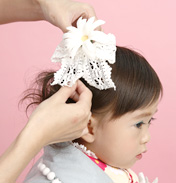 正面から見える位置を確認して、大きめの髪飾りを片側にとめる。