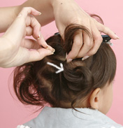 今度は上の髪をねじり、土台に向かって上からピンを刺す。