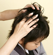 手の平にワックスをとり、髪の毛全体にしっかりなじませる。根元から上にすくいあげるようにして、軽さを出す。