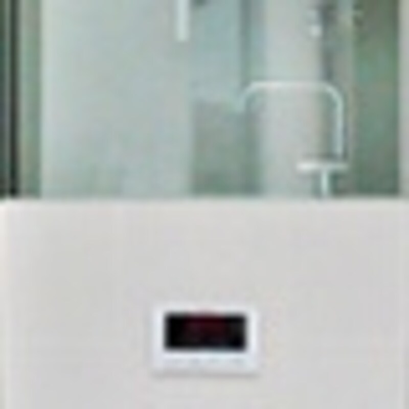 | 1. 洗面室とガラスで仕切られたバスルーム。 2. バスルーム床は30cm角のタイル張り。 3,4. バスルームの引戸を交互に開けたところ。 |