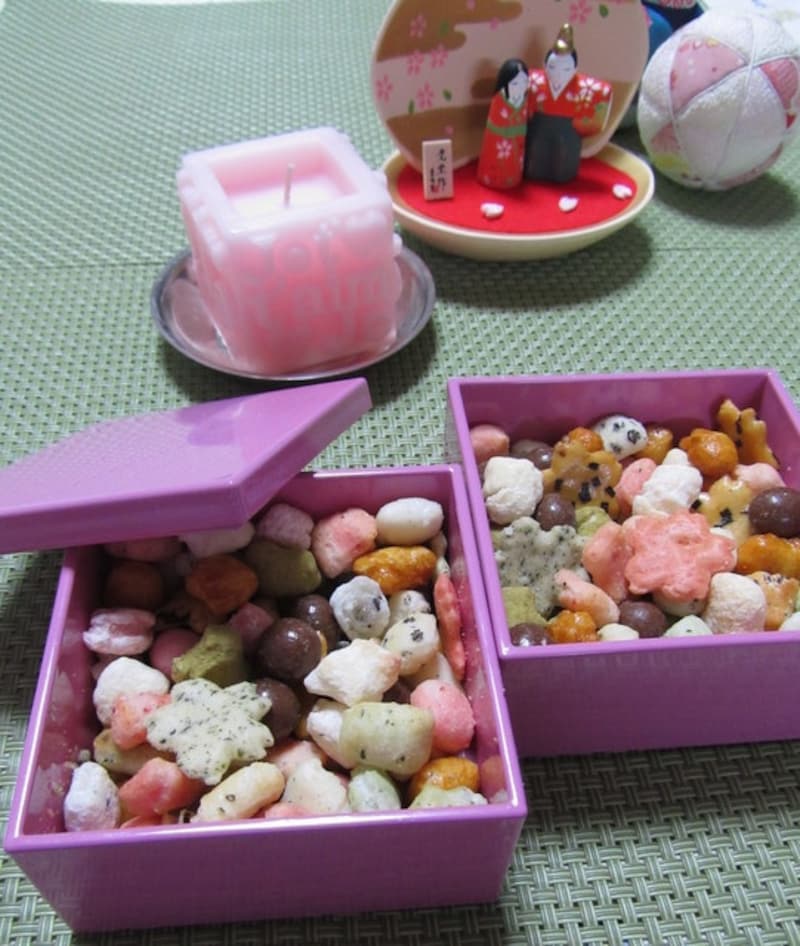 お雛菓子も実家の京都から送られてきた和菓子屋さんの雛あられを小さな小さなピンクのお重に入れてみました。