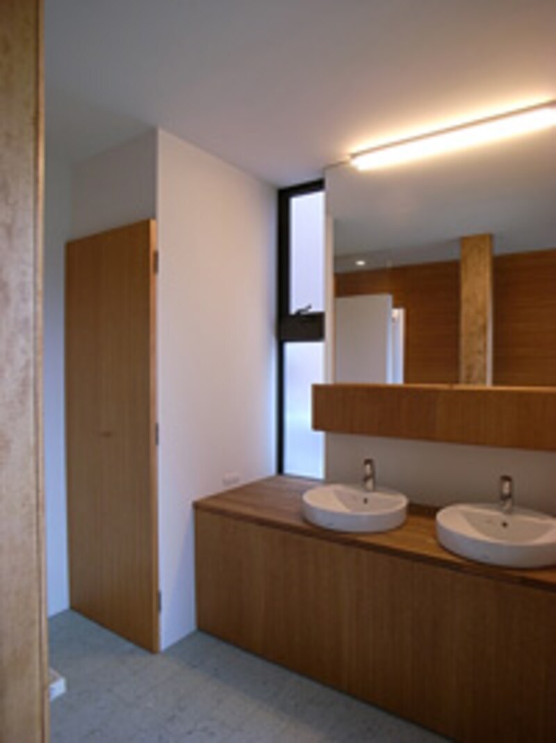 そうは言っても、もちろん毎日が晴れた日というわけにはいきません。以前ご紹介した「テレスコープハウス」と同様、室内の空間が上下につながった「青梅の家」も、エコキュートで作ったお湯で部屋を足下から暖める、温水床暖房を採用しました。両隣に家の迫った「青梅の家」は、外壁から東西の敷地境界まで、50cm強しか幅がありません。ここで困ったのがエコキュートタンクの置き場。床暖房にもお湯を使える「多機能型エコキュート」には、その幅で置ける薄型タンクの機種がなかったのです。