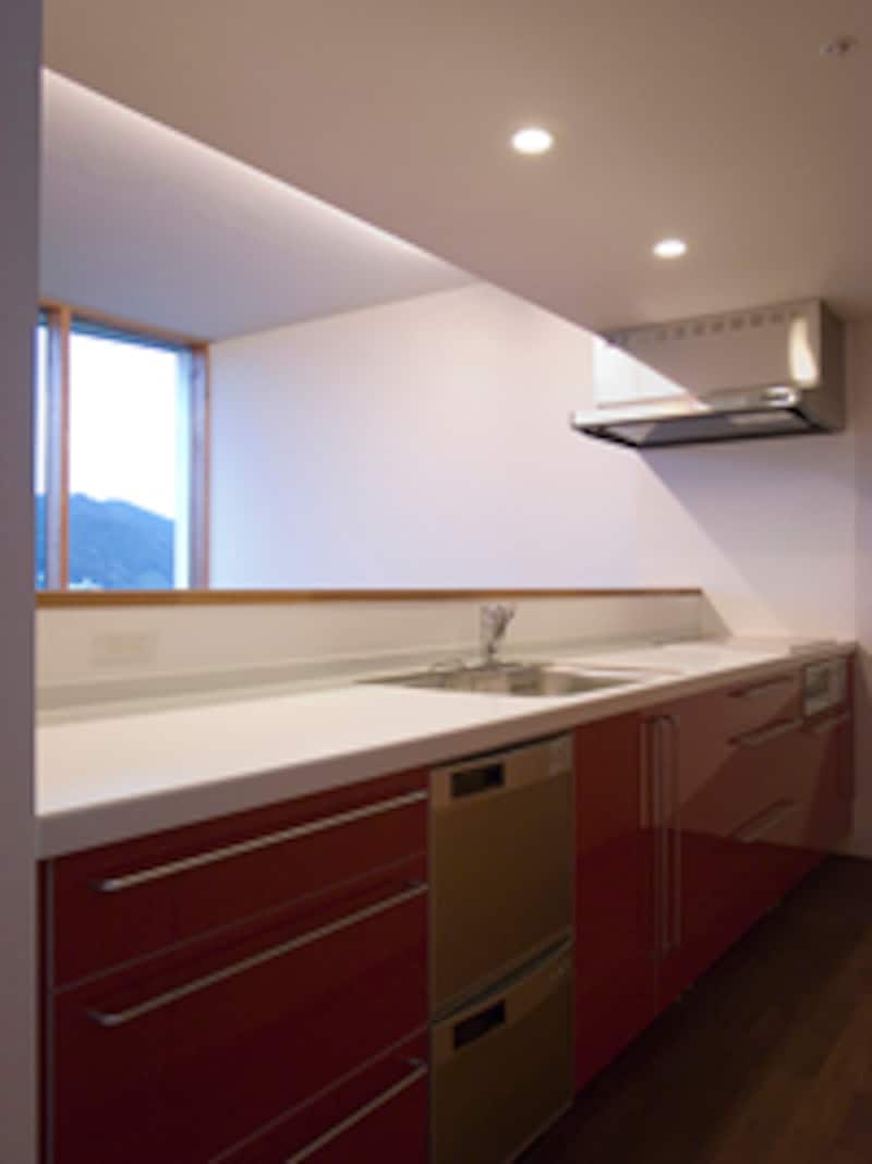 | 食堂越しに、風景を見ながら料理ができる2階のキッチン。 |