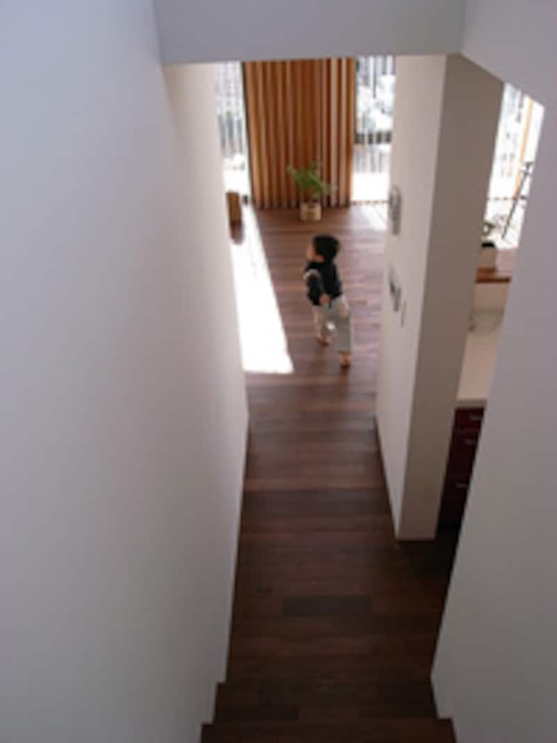 | 2階の子ども部屋からリビングを見下ろす。短い階段で家の中がつながっています。 |