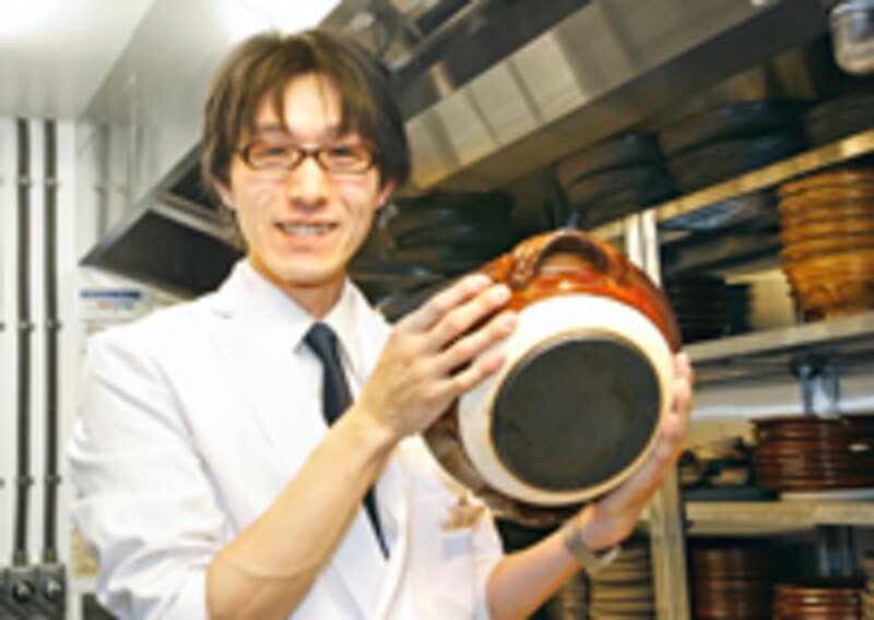 | 店長の北出誠さん。 「IHは、火が直接あたらないので、土鍋が焦げ付くことがないんですよ。」 |