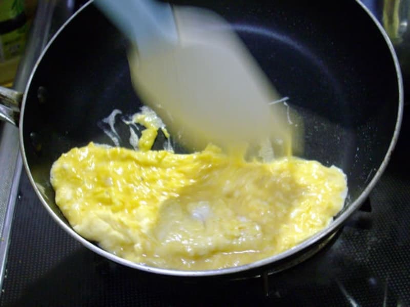 - 熱したフライパンは右側が火にあたるように傾け、そこに卵液を入れます。ここからはフライパンの右側半分だけを使います。