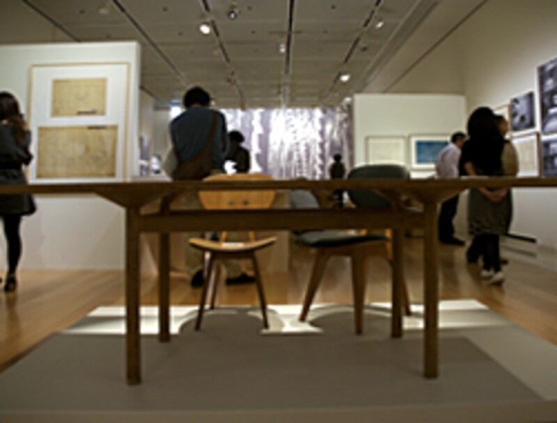 | 中央にテーブルと椅子。両脇には坂倉建築作品パネルの展示が続く。 |