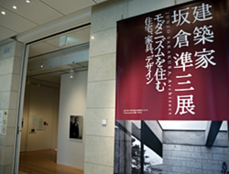 人目をひく展覧会大ポスターがエントランス右に、正面には坂倉準三のポートレイト。