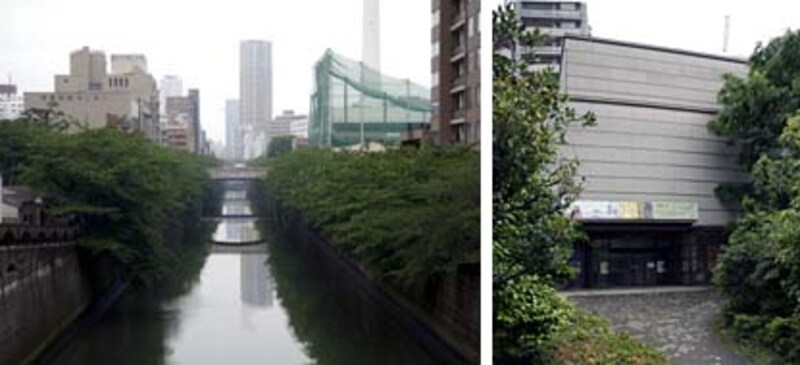| (左)JR目黒駅から徒歩5分。目黒川の目黒新橋を渡って右折、遊歩道へ。(右)約1分ほどで目黒区民センター内にある目黒区美術館へ到着。 |