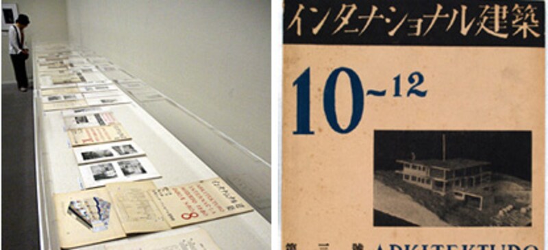 | (左)機関誌「インターナショナル建築」等貴重な資料がズラリ。(右)「インターナショナル建築」第3巻第10~12月号,1931年 (写真をクリックすると時代性のある「インターナショナル建築」表紙画像が拡大されます。) |