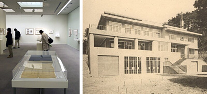 | (左)第3章会場風景。手前の展示台は上野伊三郎がデザインした「島津邸」の*貴重な図面と青焼(特別出品)。(右)「島津邸」外観(「インターナショナル建築」第1巻創刊号) |