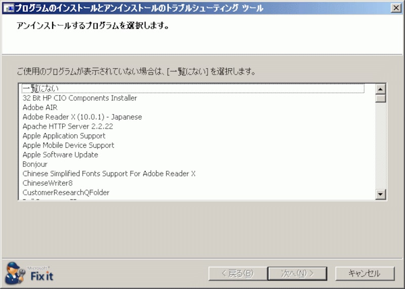 マイクロソフト社が提供しているFixitを利用して、「プログラムの追加と削除」の不具合を是正できる場合もあります。http://support.microsoft.com/kb/2438651/ja