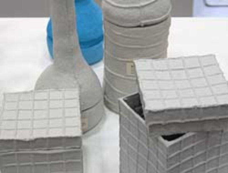 アウラコレクション「Moid Packo」 デザインは鹿目尚志。ユニークな再生紙利用のデザイン。構造・耐久性も考慮された形が異様だが、なんといっても触覚をそそられ、思わず手がのびてしまう。 ・ アウラ
