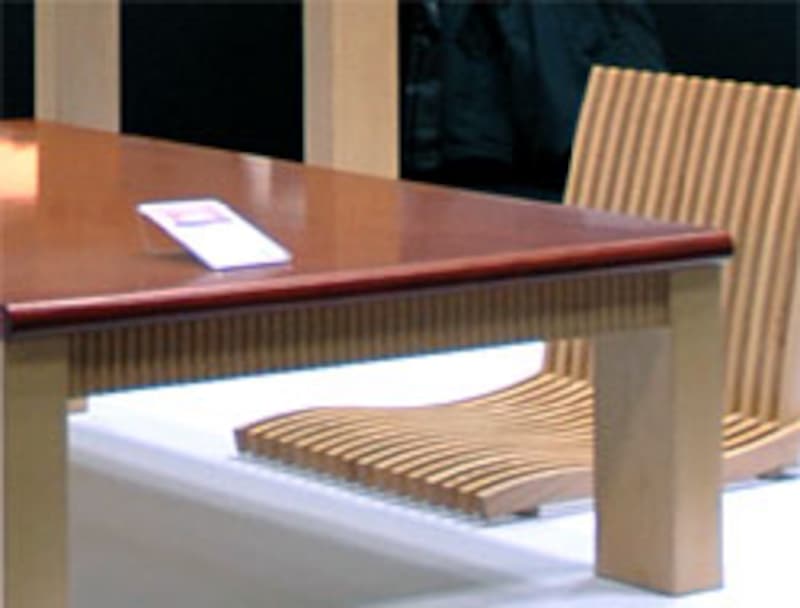 Toine.jp「さざなみ」 「座る空間」を意識して、機能性・合理性をベースに和と洋の接点となるデザインテーブル「さざなみ」。和室(座卓)でも洋室(テーブル)でも使えるように、長さの異なる脚を用意し、帯板(さざなみ)部分は、抽き出しとなっている。デザインは石川尚。 ・ TOINE.JP