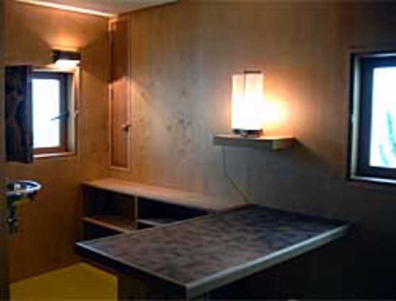 少々暗い明かりの中なのであまり人は気づかないと思うが、このビックフックには思わずニヤリ。 モノを掛けるという「機能」と空間を彩る「絵画」的要素を部屋、それもほんのちょっとして通路にさえ持ち込み、楽しんでいる・・・コルビュジェの厳格な風貌からは想像できないが、玄関先の洋服掛けフックにさえも細かい神経が注がれている、それにしてもこの大きさは。。。。。なんだかおチャメな人柄が伝わってくる。 さて、この右側が究極部屋の中だ。