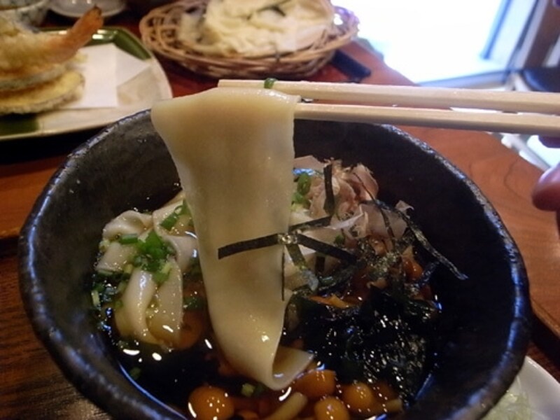 透き通るほど薄いのにコシがあり、ぷるりとした何ともいえない食感で、心地よいのど越しです。稲庭うどんの束を集めて薄く延ばし、讃岐うどんのコシを加えた感じ。要するにいいとこドリのうどんというわけです。