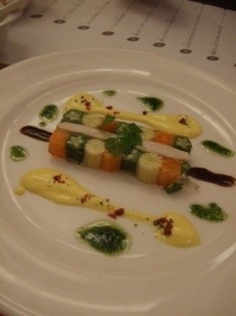 友人が選んだランチセットでは、まず、目にも美しい野菜のテリーヌ(ゼリー寄せ)が登場。シンプルゆえに、野菜の美味しさが引き立つ、とても素晴らしい料理でした。メインの豚肉も、これが豚?と思うような繊細でほろほろと柔らかい仕上がりで。北海道産の豚のレベルの高さを実感させられる味わいです。