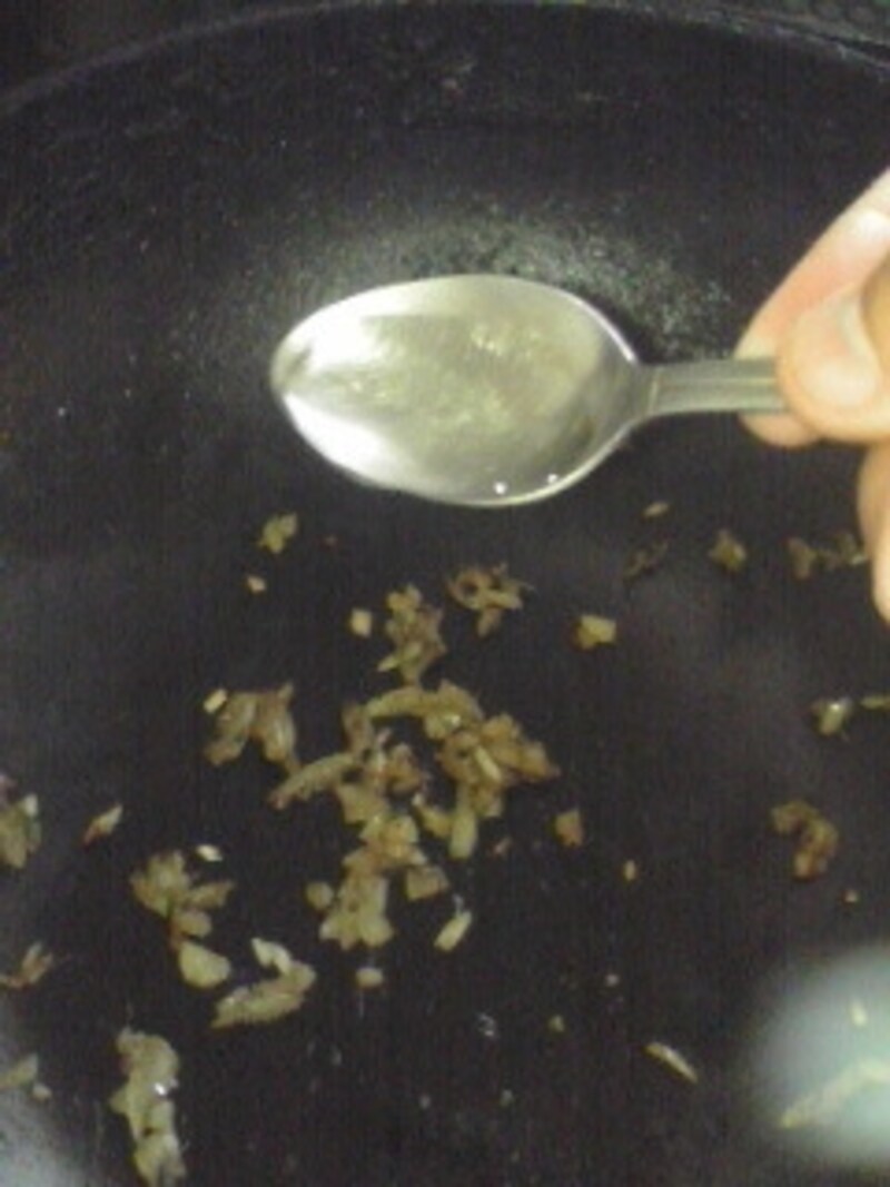- 水分が飛んできたら、たまねぎにスプーン1杯の水を加えます。すると水分が一瞬で蒸発するとともに、色が変わります。