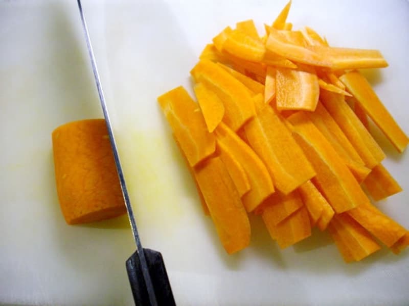 本当にきれいな短冊切りにしようとすると、カーブのある部分は使わないことになります。それはもったいないですよね。仕上がったお料理のにんじんサイズは整っていないですが、家庭料理は見た目より味重視、切りやすく無駄の出ない方法がベストだと思っています。