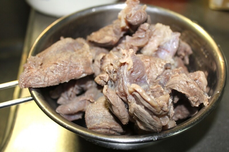 - 醤油や味噌で煮込む場合は、綺麗な鍋に下処理済みの牛すじを入れ、酒、適量。ショウガ、ひとかけ。ネギの青い所、ひとつ。