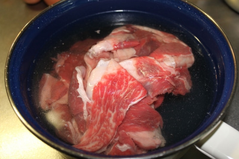 ■下処理の方法- 生の牛すじを適当な大きさに切って鍋に入れ、酒をまぶしながらほぐします。