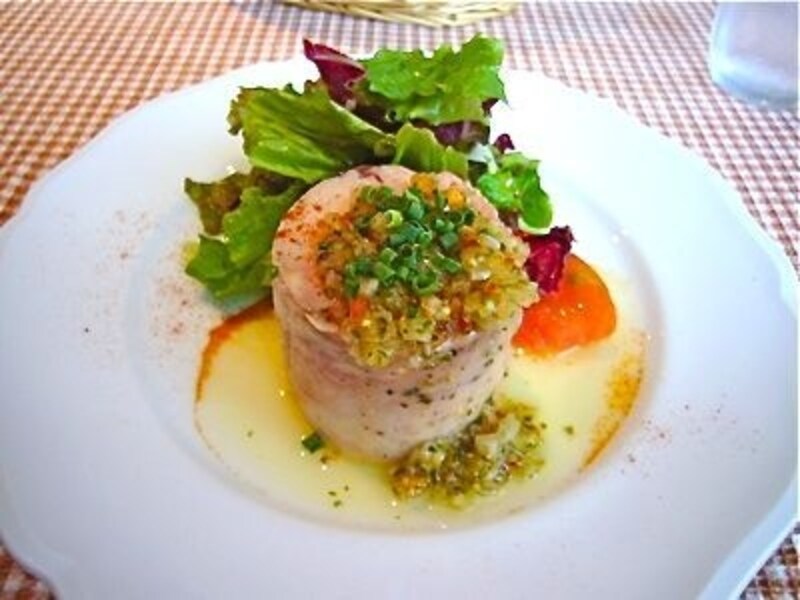 前菜は『お肉のテリーヌ南仏風』がお勧めです。四角くて薄いものを想像していましたが、とても大きなお肉なので是非食べてみてください。自家製パンも付いていて、おかわりも出来ます。