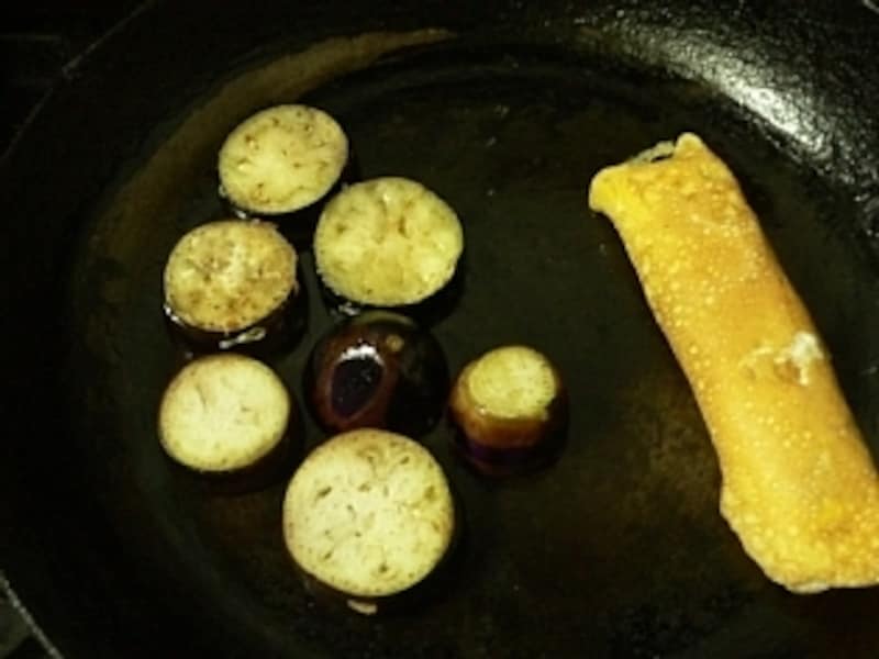 - ナスはフライパンで焼きます。同時に、青海苔と卵を混ぜて玉子焼きを作ります。