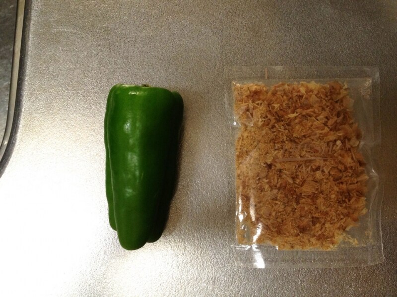 - ピーマンを縦二つに切り、種を取って千切りにします。