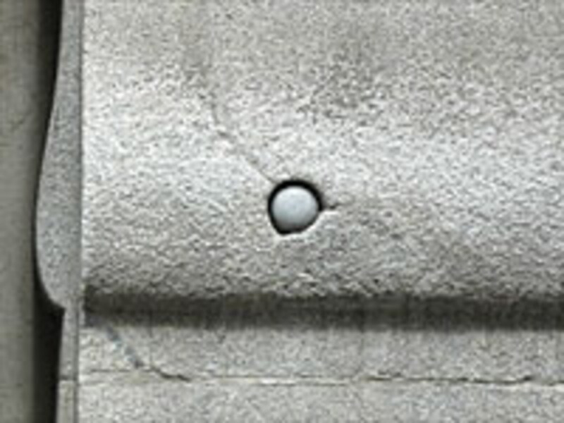 | ライトグレーの表面を触ってみると、まるで象の皮膚みたいに厚く柔らかい・・・それは、波状に加工した花崗岩。その石板に整然と打たれた鋲(固定用のボルト頭部がアルミニウム)、すこし陥没し、その周りが変形した姿が、悩ましく美しい。 (写真をクリックすると、ファサード正面左手の外壁が拡大されます。) |
