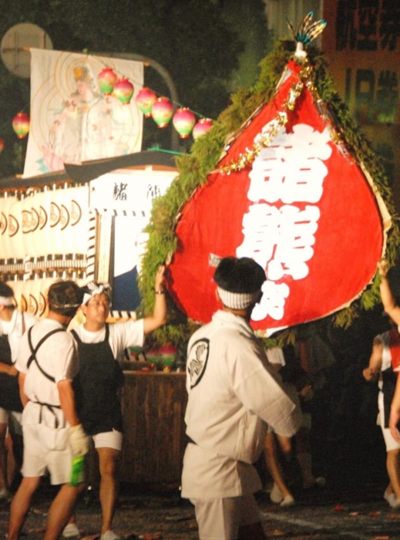 故人の霊を運ぶ精霊船は、「流し場」と言われる終着点まで曳かれていきます。船の周りには、家紋入りの提灯を持った喪主を先頭に、町の提灯を持つ人が続き、さらに、長い竿の先に、趣向を凝らした灯篭をつけた「印灯篭」と呼ばれる目印を持つ人、鉦を打つ人、その後には揃いの法被を着た人たちが続きます。