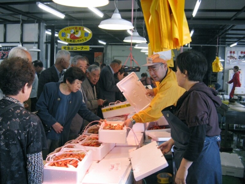 兵庫県の美方郡香美町にある、株式会社・日本海フーズの「にしとも かに市場」(直販所)。直接、前浜で競り落とした新鮮なカニや、魚介類を自社で加工・直販しています。市場内には水揚げされたばかりのピカピカの魚介類が並び、売り手・買い手の会話が飛び交い活気に溢れた雰囲気です。