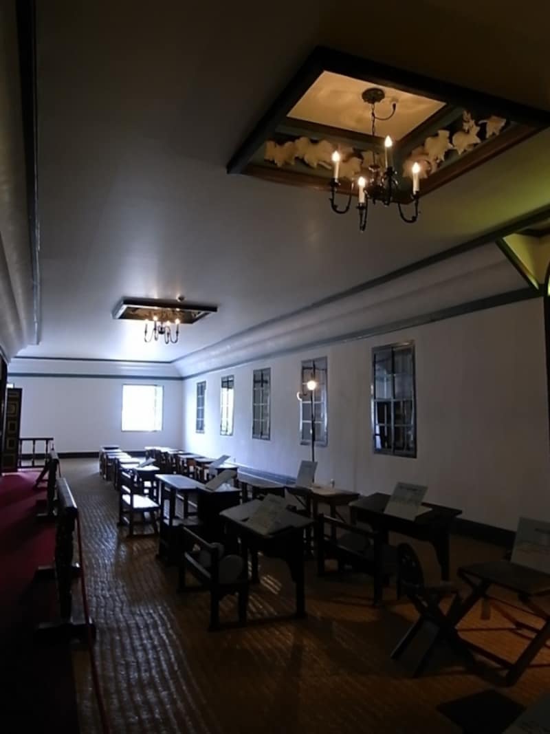 木造2階建の寄せ棟造り桟瓦葺きの建物で、中央部には八角形の塔屋、正面玄関上部のバルコニーの屋根には天使や雲などのメルヘンな彫刻が施されています。それでいてポーチには龍がいたりと、全面的に洋風になりきれない葛藤がうかがえます。それでもちっともダサくないのが不思議です。