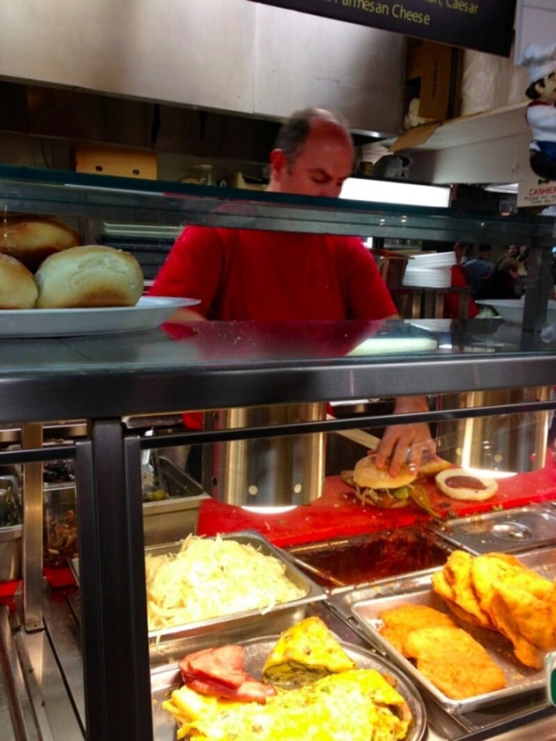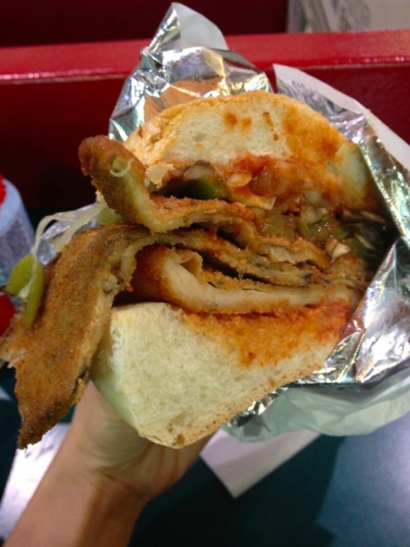 トロントの台所と言えば、「セントローレンスマーケット」。1803年のオープン以来、お肉やお魚をはじめ、ソーセージやチーズ、生パスタ、マスタード、キッチングッズ、スナックなど、さまざまな新鮮食品が集まる、歴史あるマーケットです。この中で、オススメの食べ物といえば、1階にある「Mustachio(ムスタチオ)」が販売するイタリアンサンドウィッチです。サンドウィッチには、揚げナス、チキン、マッシュルーム、タマネギなどが入っていて、少し酸味のあるトマトソースがバランスを整えてくれています。サンドウィッチはひとつ約5カナダドルほどですが、そのサイズは日本人にとってはかなり大きく、半分で十分お腹いっぱいになる量です。